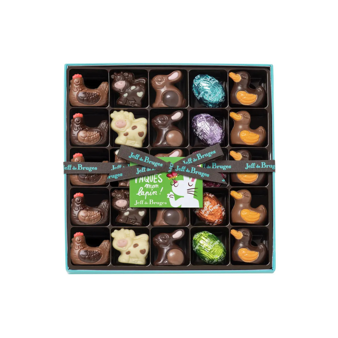Un coffret prêt à offrir, garni d’un large choix de chocolats de pâques à partager en famille ! En ouvrant cette boite, il y aura de quoi vous faire craquer et émerveiller vos enfants : des petits animaux et des oeufs colorés. Des chocolats incontournables pour Pâques, fourrés au praliné croustillant, pétillant ou moelleux, avec du caramel ou une ganache. Le tout, pour fêter l’arrivée des beaux jours avec gourmandise et audace.