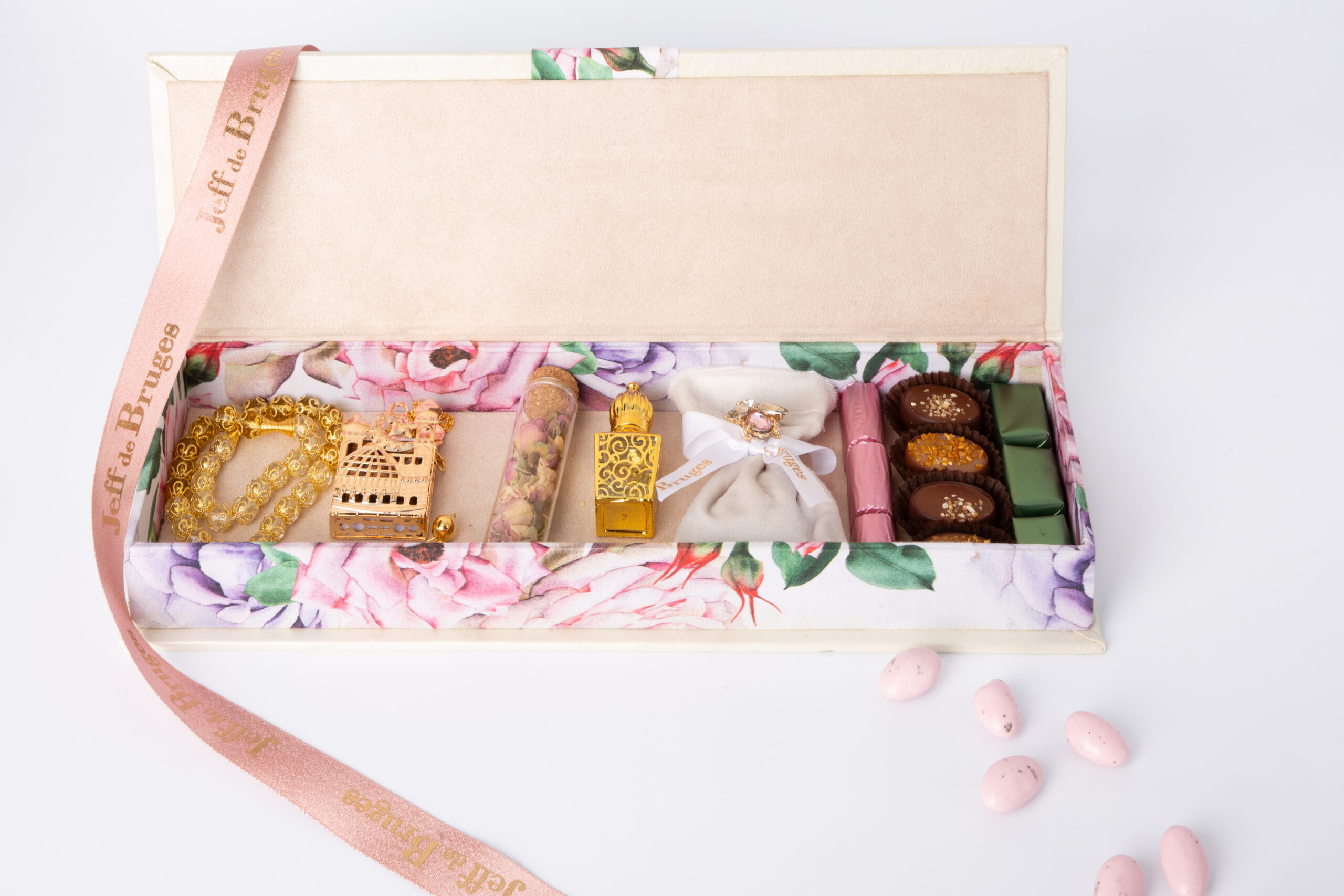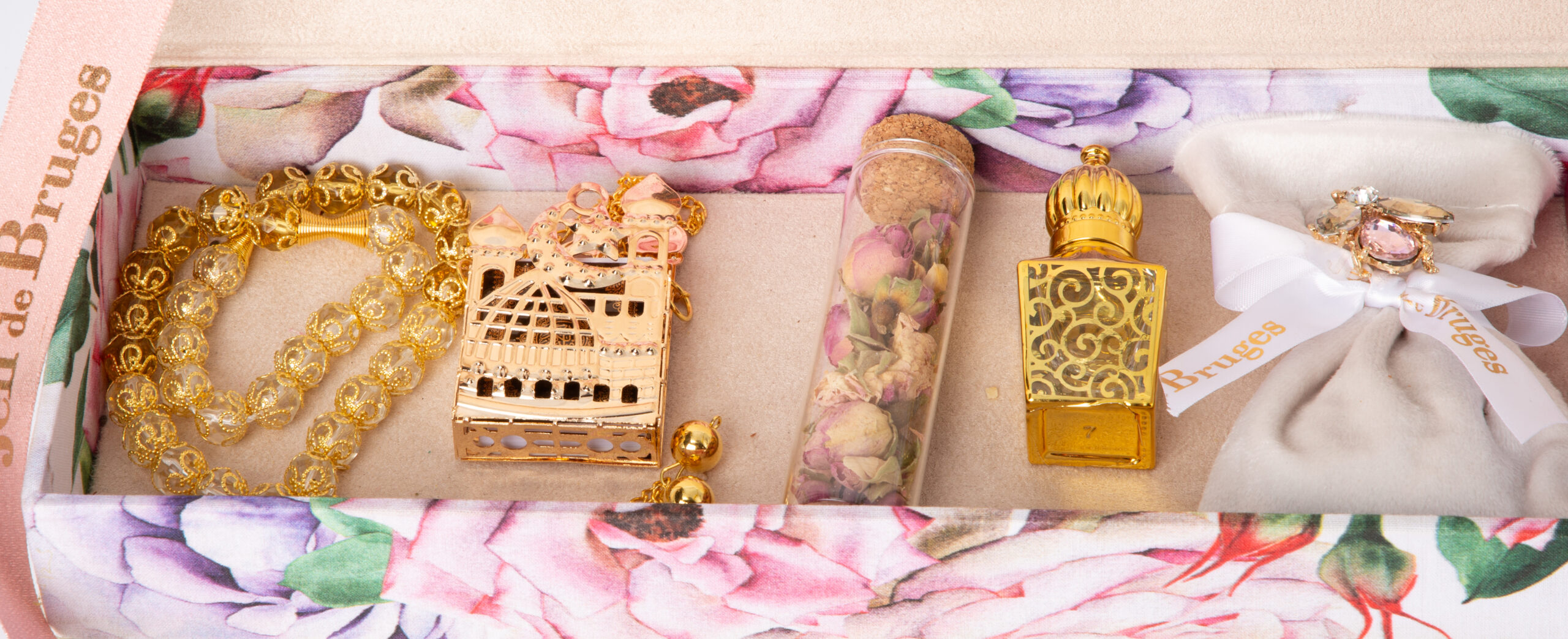 Dattes majhoul fourrées, bourse de sarghina royale avec broche, tsabih, Mushaf, fiole de 3asser yasmine et tube de ward beldi.