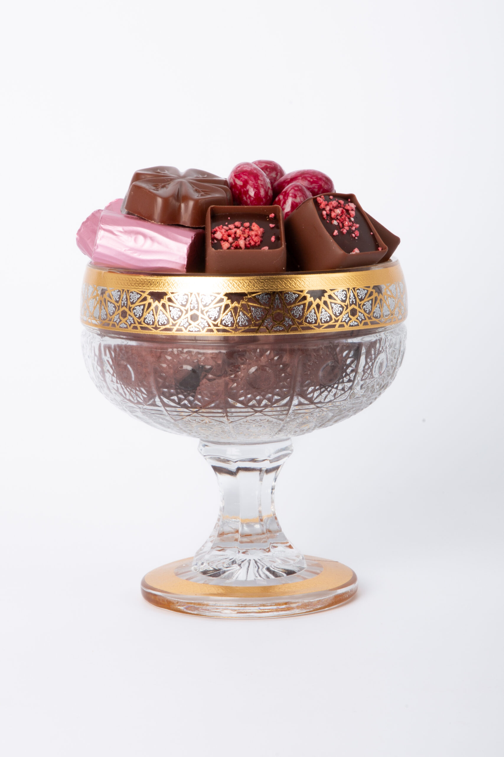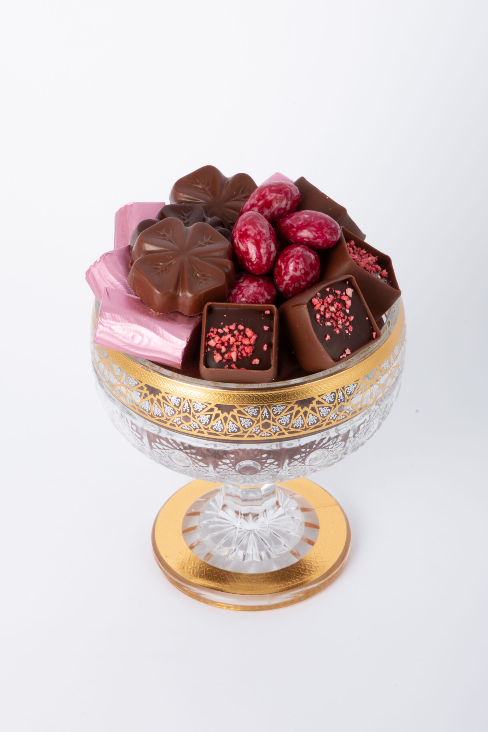 Bonbons de chocolats assortis. Ingrédients : chocolat noir (masse de cacao (fèves de cacao origine Équateur), sucre, beurre concentré (LAIT), beurre de cacao, émulsifiant : lécithines (SOJA), arôme naturel de vanille), sucre, chocolat au lait (sucre, LAIT entier en poudre, masse de cacao (fèves de cacao origine Équateur), beurre de cacao, émulsifiant : lécithines (SOJA), arôme naturel de vanille), chocolat blanc (sucre, beurre de cacao, LAIT entier en poudre, émulsifiant : lécithines (SOJA), arôme naturel de vanille), NOISETTES, pâte de cacao, beurre de cacao, LAIT entier en poudre, beurre de karité, massepain (sucre, AMANDES, sirop de glucose, stabilisant : glycérol de colza, PISTACHES, stabilisant : sorbitols, arôme naturel de pistache), huile de noix de coco, AMANDES, beurre (LAIT), crème (LAIT), huile de tournesol, éclats de crêpes dentelle (farine de BLÉ, sucre, beurre concentré (LAIT), LACTOSE (LAIT), protéines de LAIT, sel, farine d’ORGE malté, poudre à lever : carbonates de sodium), caramel (sirop de glucose, LAIT concentré sucré (LAIT écrémé, sucre), huile de noix de coco, eau, stabilisant : glycérol de colza, émulsifiants : mono- et diglycérides d’acides gras et lécithines (SOJA), sel, arôme naturel), sirop de glucose, stabilisant : glycérol de colza, meringue (sucre, beurre de cacao, amidon de BLÉ, huile de noix de coco, protéines de LAIT, poudres à lever : carbonates de sodium et carbonates d’ammonium, blanc d’OEUF), beurre concentré (LAIT), poudre de cacao dégraissé, stabilisant : sorbitols, confiture de cerises (sirop de glucose et fructose, cerises, sucre, épaississant : pectine, correcteur d’acidité : acide citrique), LAIT écrémé, eau, dextrose, arômes et arômes naturels, poudre de cacao, sirop de sucre inverti, cerises, riz soufflé (farine de riz, sucre, sel, beurre de cacao), émulsifiant : lécithines (SOJA), purée de fruit de la passion (extrait de fruits de la passion, sirop de sucre), purée de pommes, biscuit au beurre (farine de BLÉ, sucre, beurre (LAIT), OEUF, amidon de BLÉ, sel, poudre à lever : carbonates d’ammonium), fèves de cacao, nougat (sucre, sirop de, AMANDES, miel, beurre de cacao, amidon de pomme de terre, blanc d’OEUF, arôme naturel de vanille), noix de coco, sirop de sucre candi, stabilisant : sorbitols, farine de BLÉ, huile de maïs, café, amandes d’abricot, graines de SÉSAME, OEUF, raisins secs, sirop de glucose-fructose, spéculoos (farine de BLÉ, sucre, huile de colza, sirop de sucre candi, beurre concentré (LAIT), poudre à lever : bicarbonates de sodium, sel, cannelle), écorces d’oranges confites (écorces d’oranges, sucre, sirop de glucose-fructose, correcteur d’acidité : acide citrique), NOIX de pécan, thé Earl Grey, blanc d’OEUF, extrait sec de citron, jus de pulpe de cacao concentré, pulpe de cacao, sirop de sucre, amidon de BLÉ, sucre caramélisé, épices (cannelle, clou de girofle), sel de Guérande, mangue, framboises, coriandre, LAIT écrémé en poudre, amidon de riz, sel, correcteurs d’acidité : acide citrique et acide malique, colorant : caramel d’ammonium, extrait de paprika, aliments colorants (concentrés de spiruline, de pomme, de groseille, de radis et caroténoïdes), citron, jus de citron vert concentré, jus de sureau, citron yuzu, gingembre, amidon de tapioca, poudres à lever : carbonates d’ammonium et carbonates de sodium, piment d’Espelette, arômes naturels (cacao, orange, vanille, framboise, yuzu), extrait naturel de vanille Bourbon, matière grasse laitière anhydre (LAIT), huile de citron vert, émulsifiant : lécithine de tournesol, colorant : curcumine, vanille en poudre. Les recettes peuvent contenir des traces d’arachides et d’autres fruits à coque.