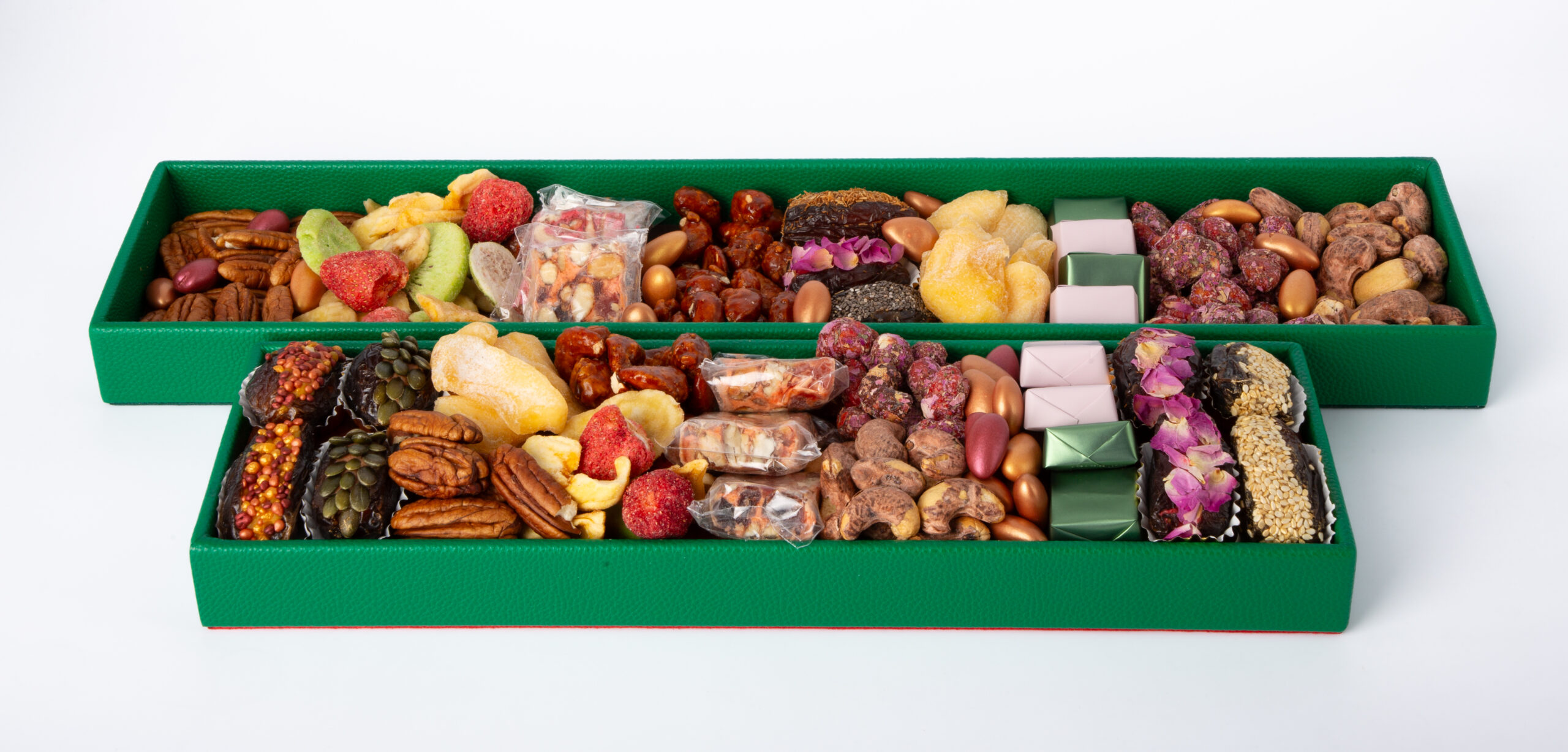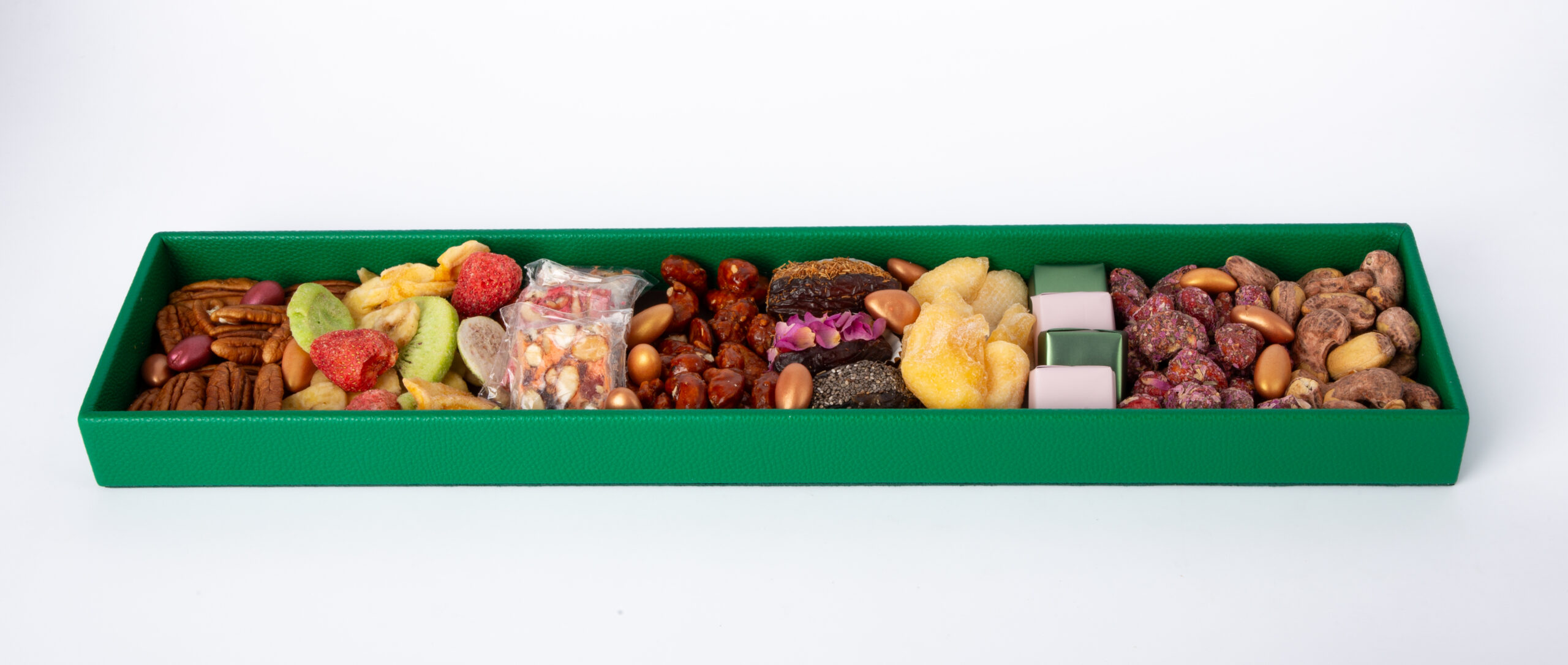Assortiment varié de chocolats, dattes majhoul fourrées, nougat, fakia et fruits lyophilisés.